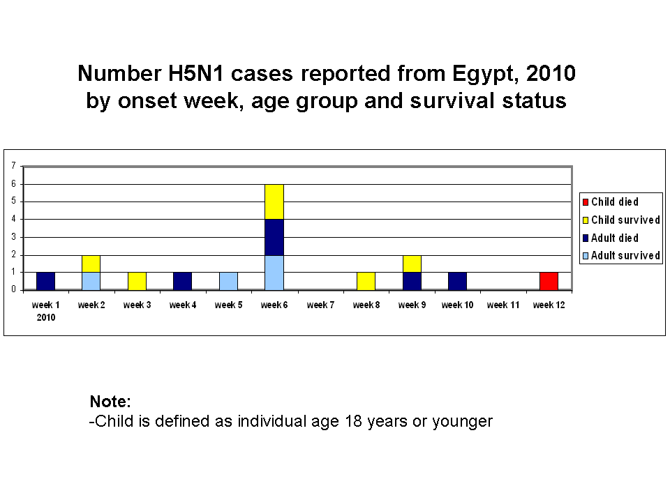 Egypt: Bar Graph: # of H5N1 Cases 2010, By Onset Week, Age Group & Survival Status